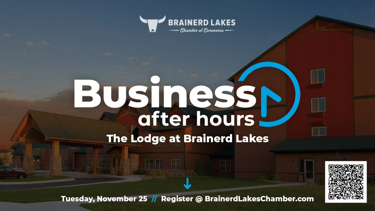 Gather your business team, family, friends and join us for our most popular networking event, Business After Hours, hosted by The Lodge at Brainerd Lakes on Tuesday, November 25, 2025, from 4:30 - 6:00PM. Guests will enjoy this highly popular networking event by mixing with other Chamber members, a variety of delicious appetizers, cash bar, self-guided tours, chances for prizes, and learning more about this all inclusive hotel from Brandon Lloyd, General Manager, during his interview with Matt Kilian, Brainerd Lakes Chamber President, as part of this free business networking social event.