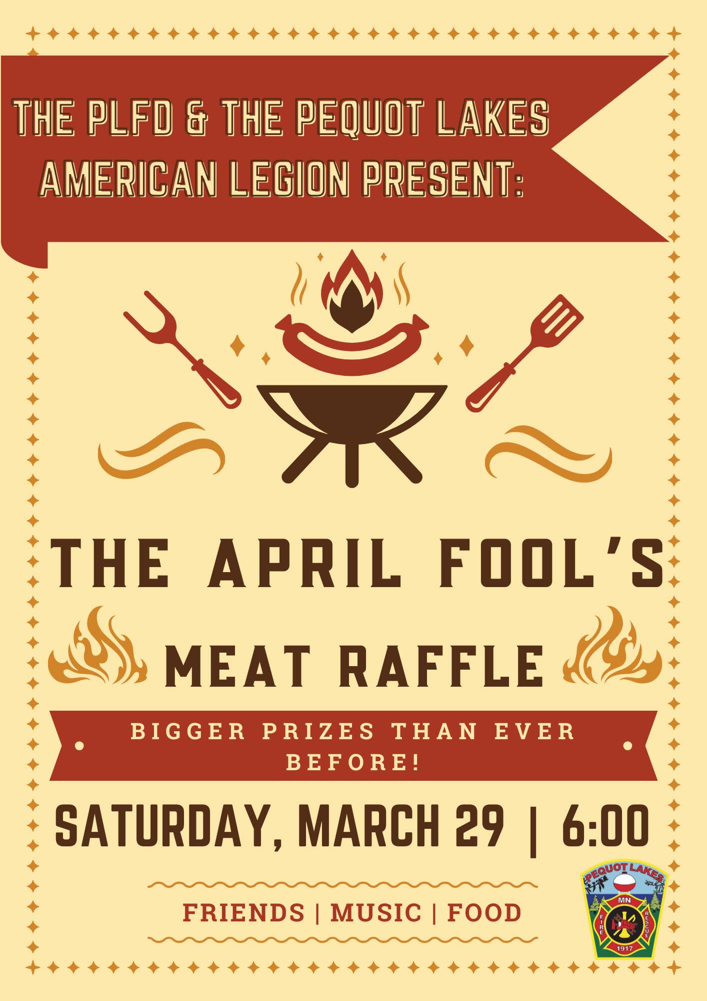 This is our largest meat raffle of the year! The Pequot Lakes Fire District teamed with our Legion Gambling to make this a fun event! There will likely be some shenanigans along the way but is all in the name of fun and the funds go for a great cause - the PLFD!!