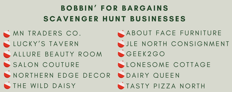 Pequot Lakes merchants know you need more shopping opportunities for convenience and safety, so they’re bringing you a week of deals, specials, and lots of fun! The celebration will kick off Monday, December 4th and end on Saturday, December 9th (right before Santa bobs into town). Look for the Bobbin' For Bargains poster in participating businesses.