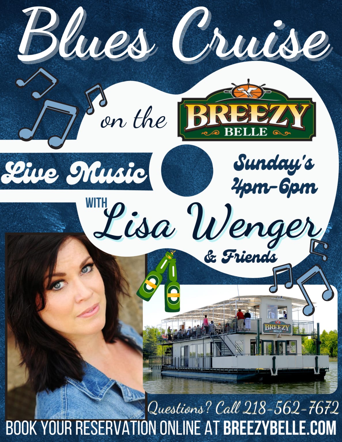 Enjoy a 4p-6p cruise on beautiful Pelican Lake with live music from Lisa Wenger & friends.