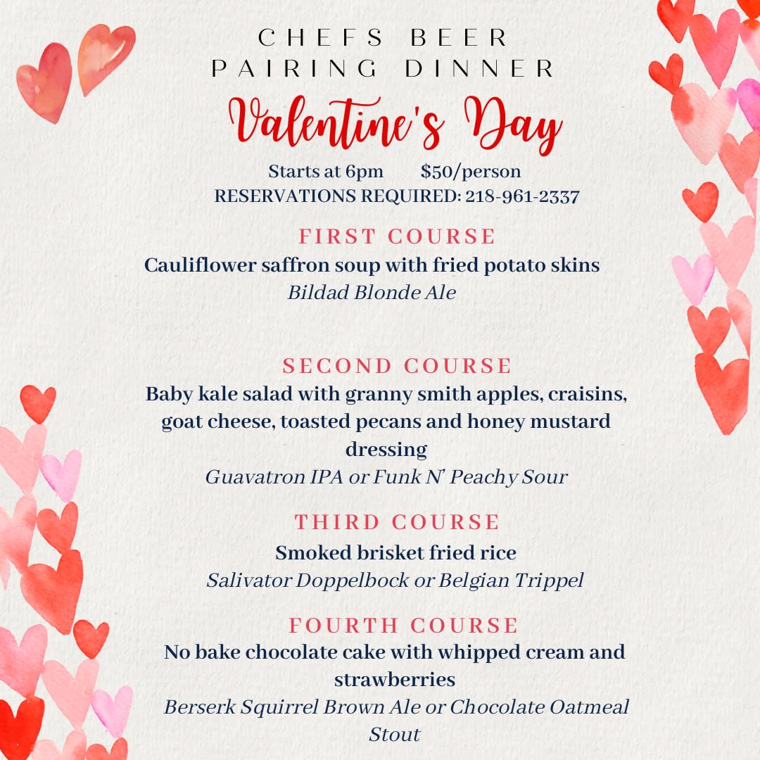 Leave your Valentines Dinner to us. Join us for a four course meal prepared by Chef AJ. You’ll get four unique courses, each paired with one of our beers for a unique and fun tasting experience. $50 per person, reservations required, please call 218.961.2337Images