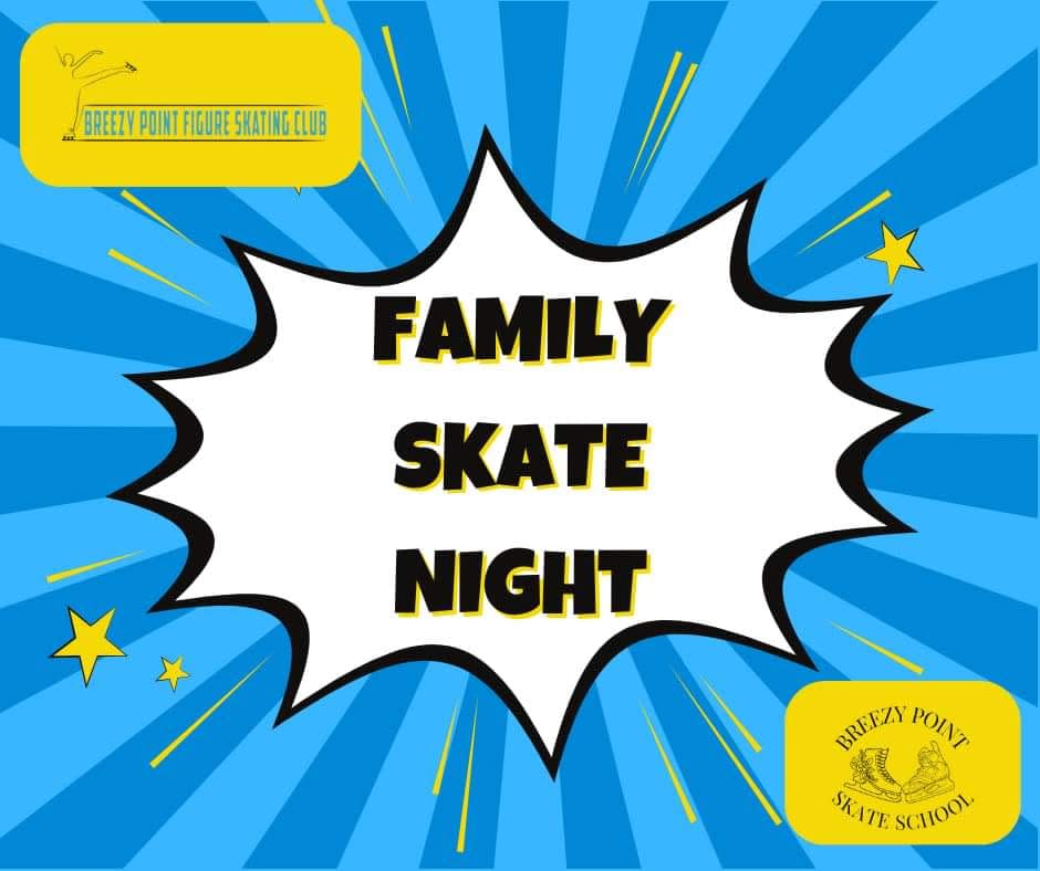 Family Skate Night Hosted by Breezy Point Figure Skating Club Open to the Public! $5 per skater, $20 cap for families Includes- 1 hour of ice time, and rental skates Note: limited rental skate sizes. First come, first serve No hockey sticks, pucks or street shoes allowed on the ice during Family Skate Night. If you have an inexperienced skater, we do have pushers available. Please put helmets on inexperienced skaters. We are so excited to see you there!Images