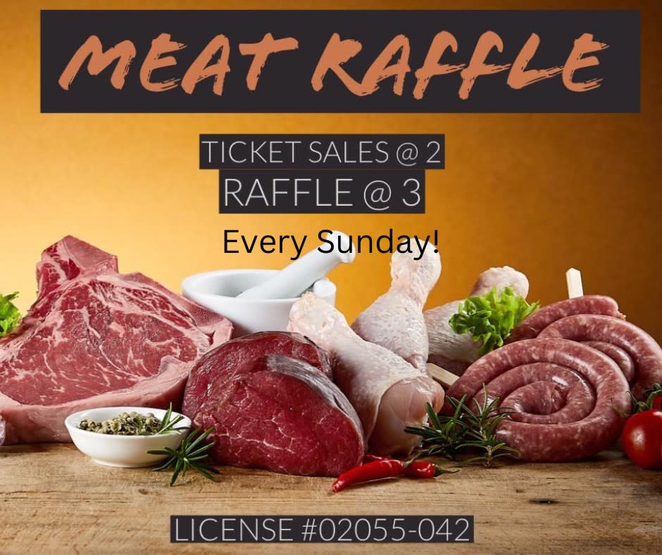 Our weekly Meat Raffle. Sponsored by Northern Lakes Hockey and meat provided by Emily meats. Tickets go on sale at 2:00pm and raffle at 3:00pm.Images