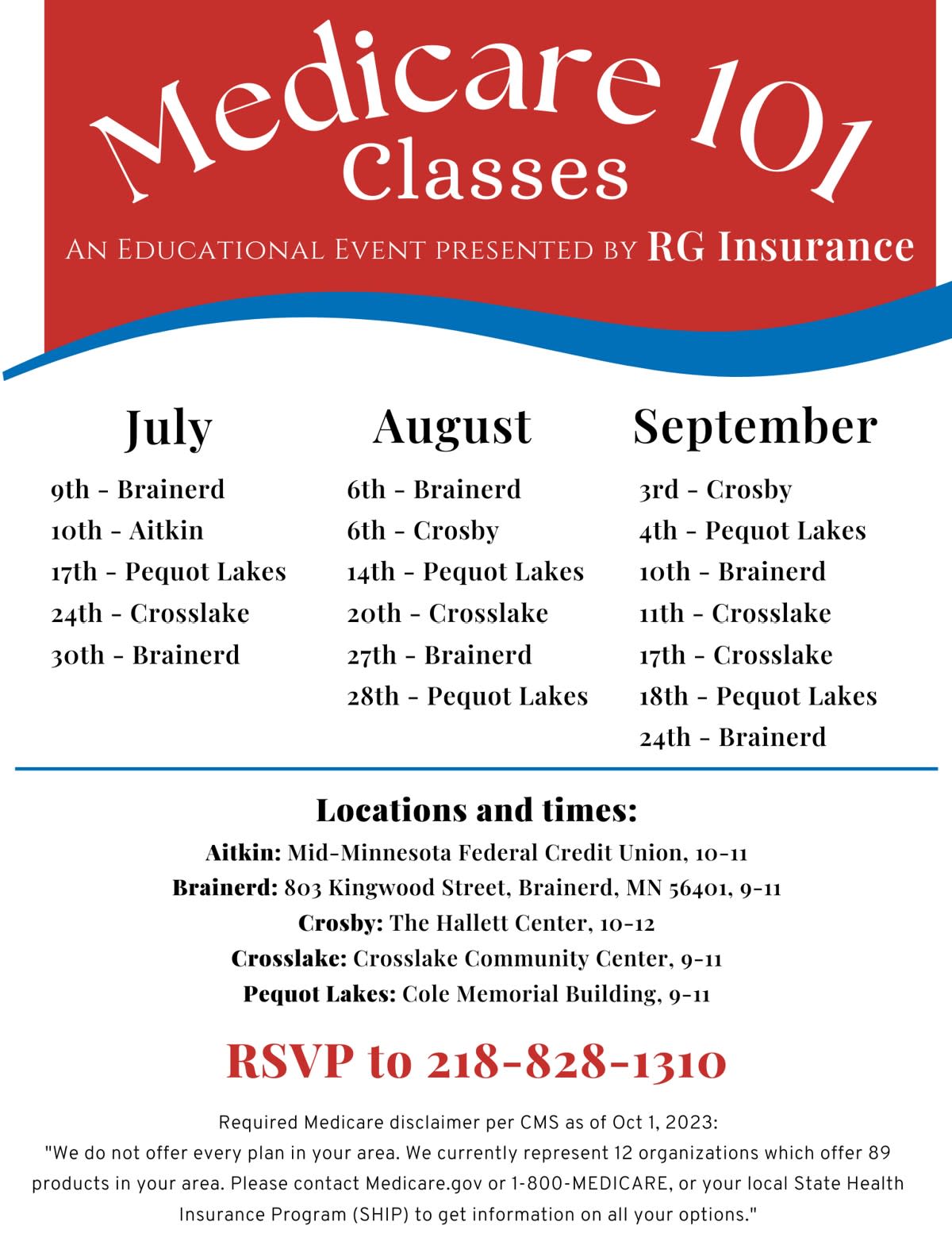 Medicare 101 Class- An Educational Event Presented by RG INSURANCE. Required Medicare disclaimer per CMS as of Oct 1, 2023. “We do not offer every plan in your area. We currently represent 12 organizations which offer 89 products in your area. Please contact Medicare.gov or 1-800-MEDICARE, or your local State Health Insurance Program (SHIP) to get all your options.”