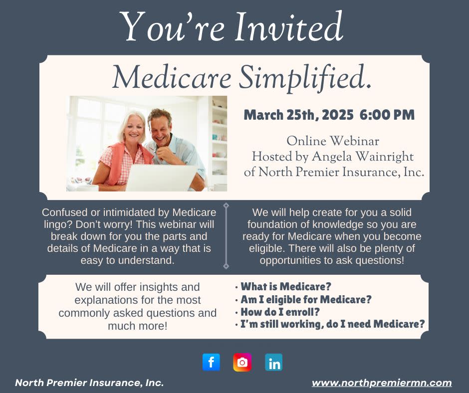 Confused or intimidated by Medicare lingo? Don’t worry! This webinar will break down the parts and details of Medicare in a way that is easy to understand. We will create a solid foundation of knowledge so you are ready for Medicare when you become eligible. There will also be plenty of opportunities to ask questions!