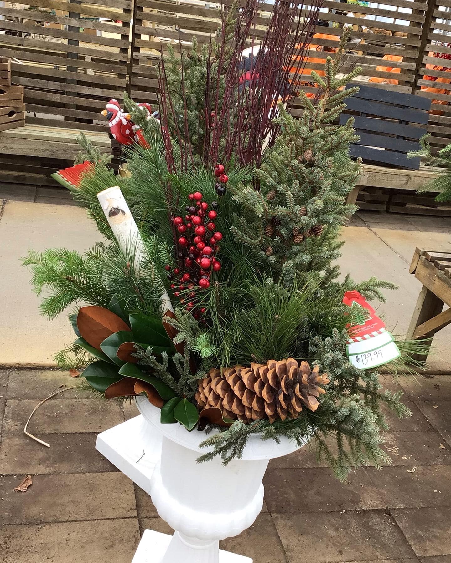 Make n Take 11/11 or 11/18, 4pm-6pm. Includes 12 inch fiber pot, spruce tops, assorted greens, berries, branches and cones. $65. Birch poles and ribbon extra.Images