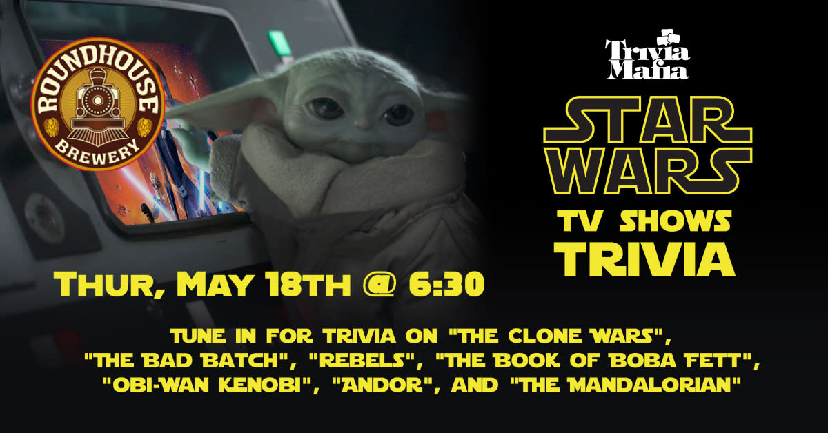Join us on Thursday, May 18th for a very special one-off night of Themed Trivia! Starting with "The Clone Wars" and continuing through season 3 of "The Mandalorian," we're covering the seven recent small screen series in the "Star Wars" universe. This is the way, and these are, in fact, the droid questions you're looking for!