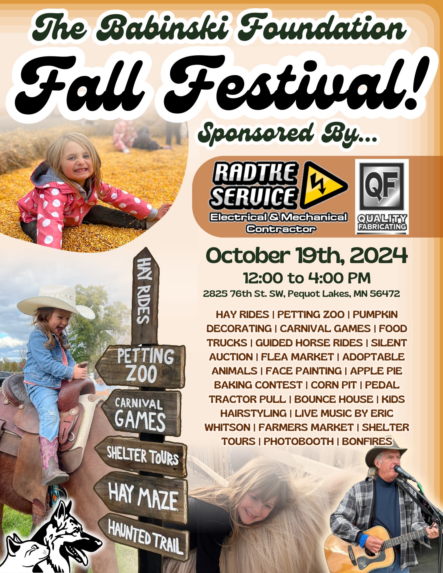 The Babinski Foundation Animal Shelter is back with another year of Fall Festivities! Join us for an unforgettable day of family fun at the Babinski Foundation Fall Festival on October 19th, 2024, from 12:00 to 4:00 PM! Thanks to our main sponsors, Radtke Service and Quality Fabricating, we're able to make this year all the more fun!