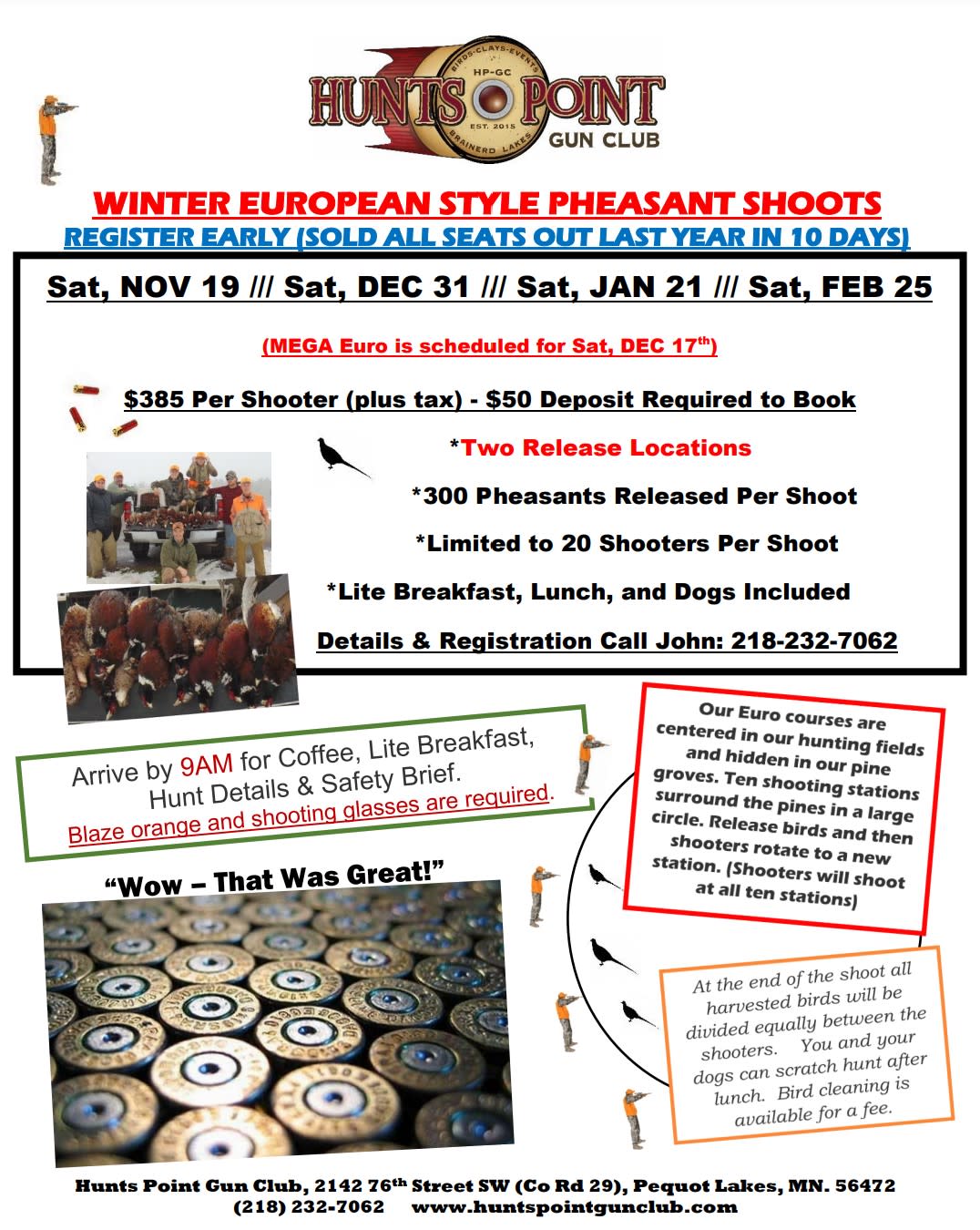 *Two Release Locations *300 Pheasants Released Per Shoot *Limited to 20 Shooters Per Shoot *Lite Breakfast, Lunch, and Dogs Included