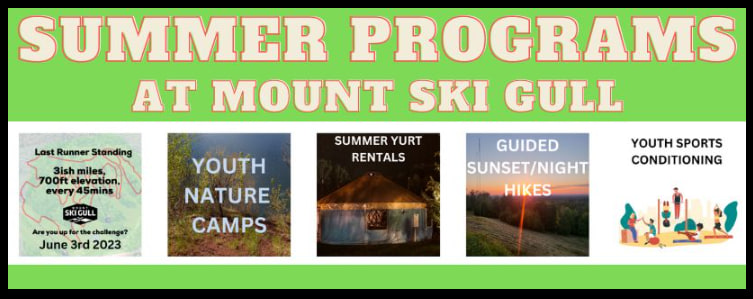 Who: Youth Ages 8-12 June Dates 6/6 10AM-NOON : Water Ecology I 6/13 10AM-NOON : Orienteering 6/20 10AM-NOON : Water Ecology II July Dates 7/18 10AM-NOON : Teambuilding August Dates 8/1 10AM-NOON : Fort & Fire Building 8/8 10AM-NOON : Insects, Bugs, & Animal Tracks What to Bring: Along with a positive attitude and love for the outdoors, campers should bring a water bottle and be dressed to be outside for the entirety of the session, along with being prepared to walk up 1 mile, bug spray and sunscreen are also recommended. Register online at https://www.mountskigull.com/kids-nature-camp.html Fees/Admission $10/session per youth. Scholarships are available please email info@mountskigull.com for information.